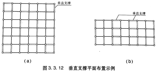 3.3.12 当建筑平面为方形或接近方形时,支撑宜布置在建筑物中部和四角(图3.3.12a);当为狭长形柱网时,宜在横向(短边)的两端及中部布置,纵向(长边)宜布置在柱网中部(图3.3.12b),以避免温度变形受到限制。