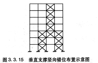 3.3.15 竖向支撑在竖向宜采用同一种形式,当竖向支撑无法连续贯通时,应移到相邻柱间,且上下支撑至少应互相搭接一个楼层(图3.3.15)。
