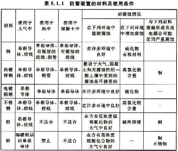5.1.1 防雷装置使用的材料及其应用条件,宜符合表5.1.1的规定。