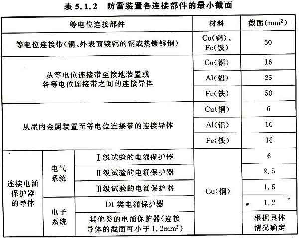 5.1.2 防雷等电位连接各连接部件的最小截面,应符合表5.1.2的规定。连接单台或多台Ⅰ级分类试验或D1类电涌保护器的单根导体的最小截面,尚应按下式计算: