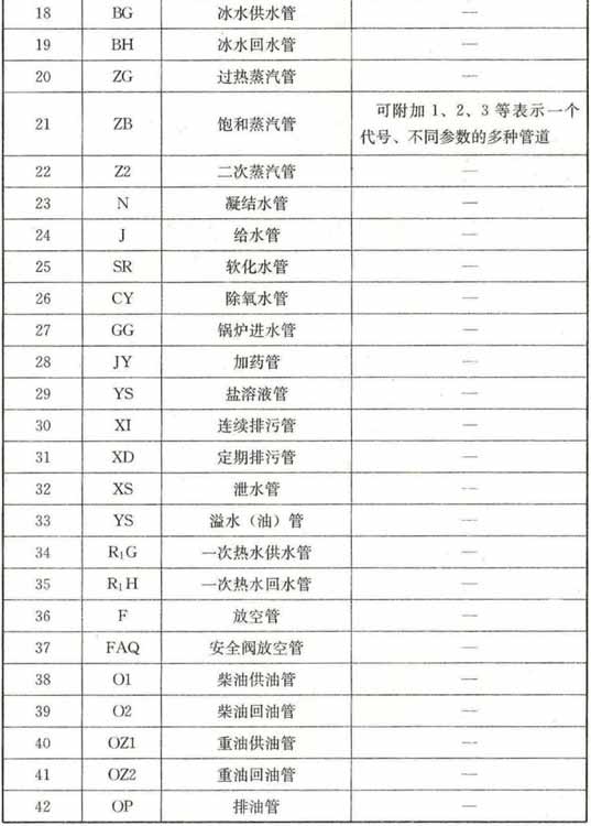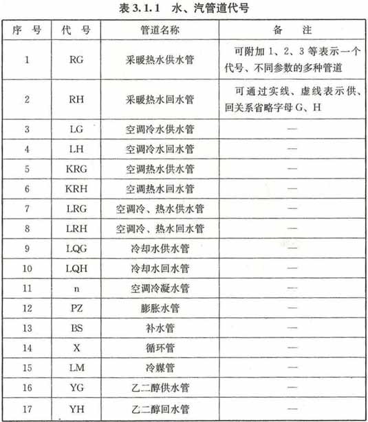 3.1.1 水、汽管道可用线型区分,也可用代号区分。水、汽管道代号宜按表3.1.1采用。