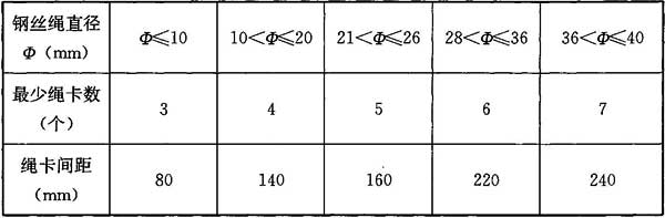 6)当采用绳卡固接时,固接强度应达到钢丝绳破断拉力的85%;绳卡与钢丝绳的直径应匹配,规格、数量应符合表7.1.7的规定。
