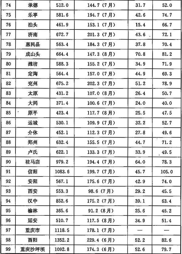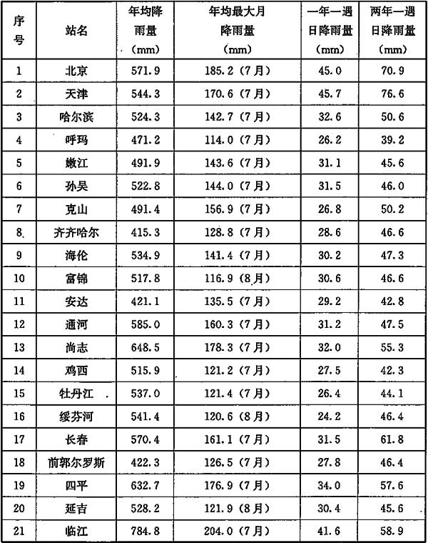注:1 表中给出的“一年一遇日降雨量”和“两年一遇日降雨量”是根据实测降雨资料系列,经拟合而成的“年最大值法降雨量与重现期公式”计算而得,与实测统计数据稍有出入,供使用过程中参考;