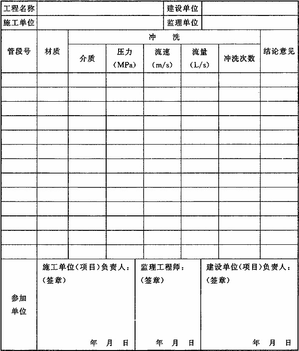 C.0.3 消防给水及消火栓系统管网冲洗记录应由施工单位质量检查员填写,监理工程师(建设单位项目负责人)应组织施工单位项目负责人等进行验收,并应按表C.0.3填写。