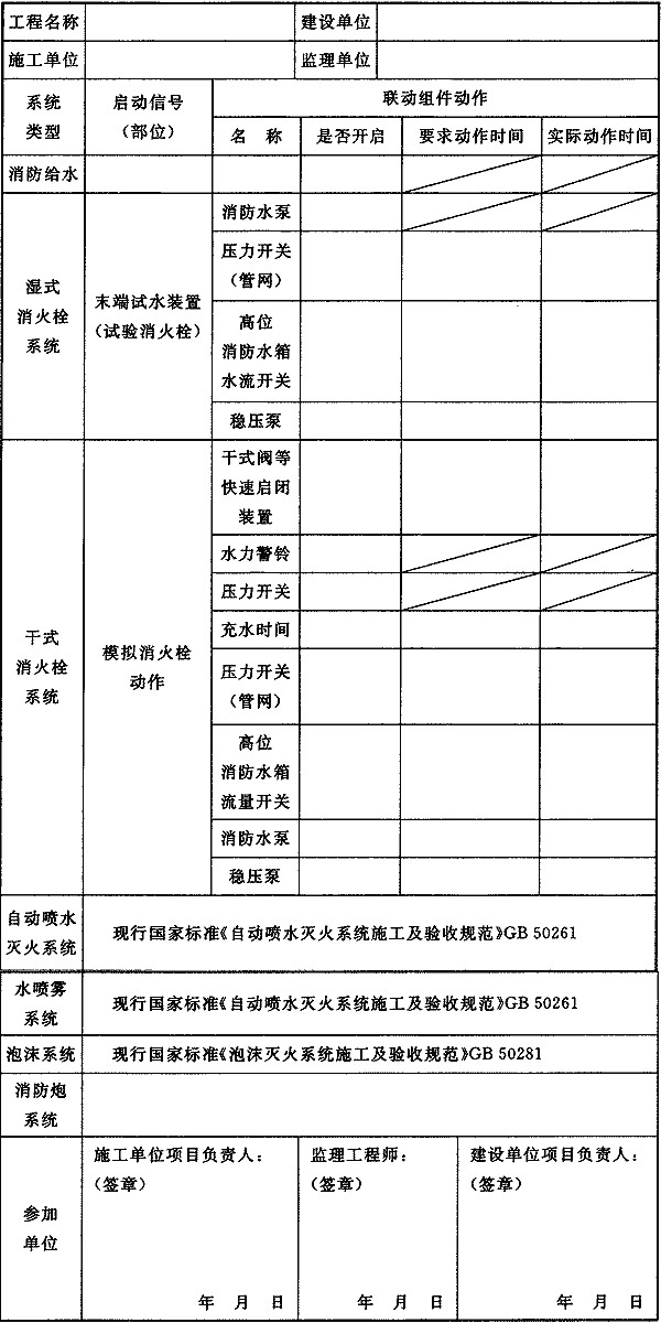C.0.4 消防给水及消火栓系统联锁试验记录应由施工单位质量检查员填写,监理工程师(建设单位项目负责人)应组织施工单位项目负责人等进行验收,并应按表C.0.4填写。