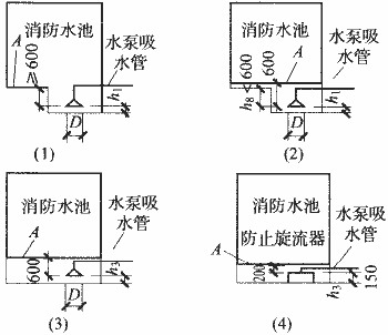 A-消防水池最低水位线;D-吸水管喇叭口直径;