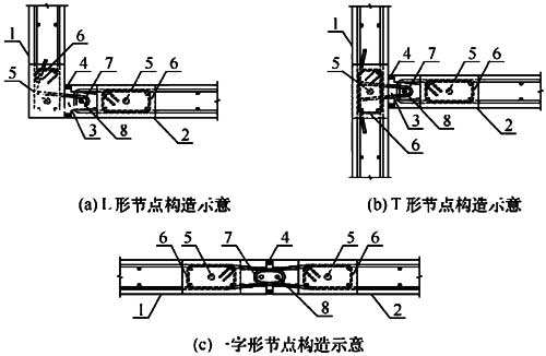 1-纵向预制墙体;2-横向预制墙体;3-后浇段;4-密封条;5-边缘构件纵向受力钢筋;6-边缘构件箍筋;7-预留水平钢筋锚环;8-节点后插纵筋