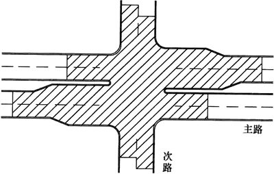 交叉口功能区的定义对交叉口本身的交通运行的机动性和安全性有着重要意义。机动车进入交叉口要进行一系列复杂的操作:反应、减速、排队等待、转向或穿越、加速等等,功能区则是实施这一系列复杂操作的面积范围,或者说是交叉口对其相交道路的影响区域范围。在交叉口功能区之外,车辆以正常速度行驶,其特征符合路段交通特征。因此,对于交叉口的功能区的设计指标要求高于路段的设计标准。