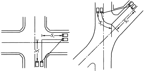 7.2.7 汽车驶近平面交叉口时,驾驶员应能看清整个交叉道路上车辆的行驶情况,以便能顺利地驶过交叉口或及时停车,避免发生碰撞。这段距离必须大于或等于停车视距(Ss)。视距三角区应以最不利情况绘制,在三角形范围内,不准有任何妨碍视线的各种障碍物。十字形和X形交叉口视距三角形范围如图3。