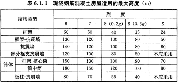 6.1.1 本章适用的现浇钢筋混凝土房屋的结构类型和最大高度应符合表6.1.1的要求。平面和竖向均不规则的结构,适用的最大高度宜适当降低。