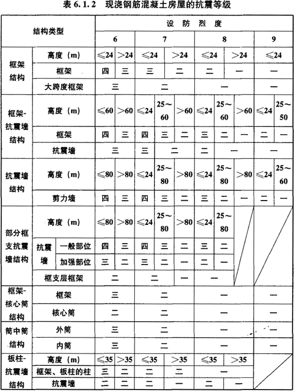 6.1.2 钢筋混凝土房屋应根据设防类别、烈度、结构类型和房屋高度采用不同的抗震等级,并应符合相应的计算和构造措施要求。丙类建筑的抗震等级应按表6.1.2确定。