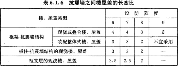 6.1.6 框架-抗震墙、板柱-抗震墙结构以及框支层中,抗震墙之间无大洞口的楼、屋盖的长宽比,不宜超过表6.1.6的规定;超过时,应计入楼盖平面内变形的影响。