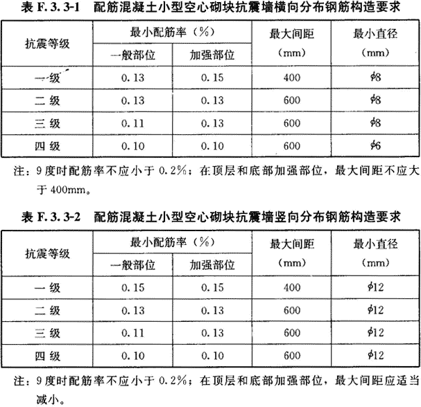 F.3.3 配筋混凝土小型空心砌块抗震墙的横向和竖向分布钢筋应符合表F.3.3-1和F.3.3-2的要求;横向分布钢筋宜双排布置,双排分布钢筋之间拉结筋的间距不应大于400mm,直径不应小于6mm;竖向分布钢筋宜采用单排布置,直径不应大于25mm。