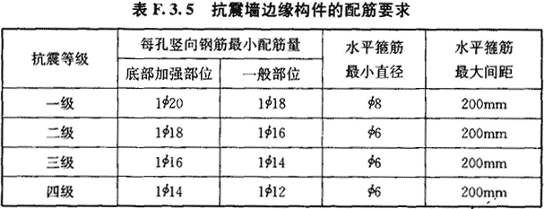F.3.5 配筋混凝土小型空心砌块抗震墙墙肢端部应设置边缘构件;底部加强部位的轴压比,一级大于0.2和二级大于0.3时,应设置约束边缘构件。构造边缘构件的配筋范围:无翼墙端部为3孔配筋;“L”形转角节点为3孔配筋;“T”形转角节点为4孔配筋;边缘构件范围内应设置水平箍筋,最小配筋应符合表F.3.5的要求。约束边缘构件的范围应沿受力方向比构造边缘构件增加1孔,水平箍筋应相应加强,也可采用混凝土边框柱加强。